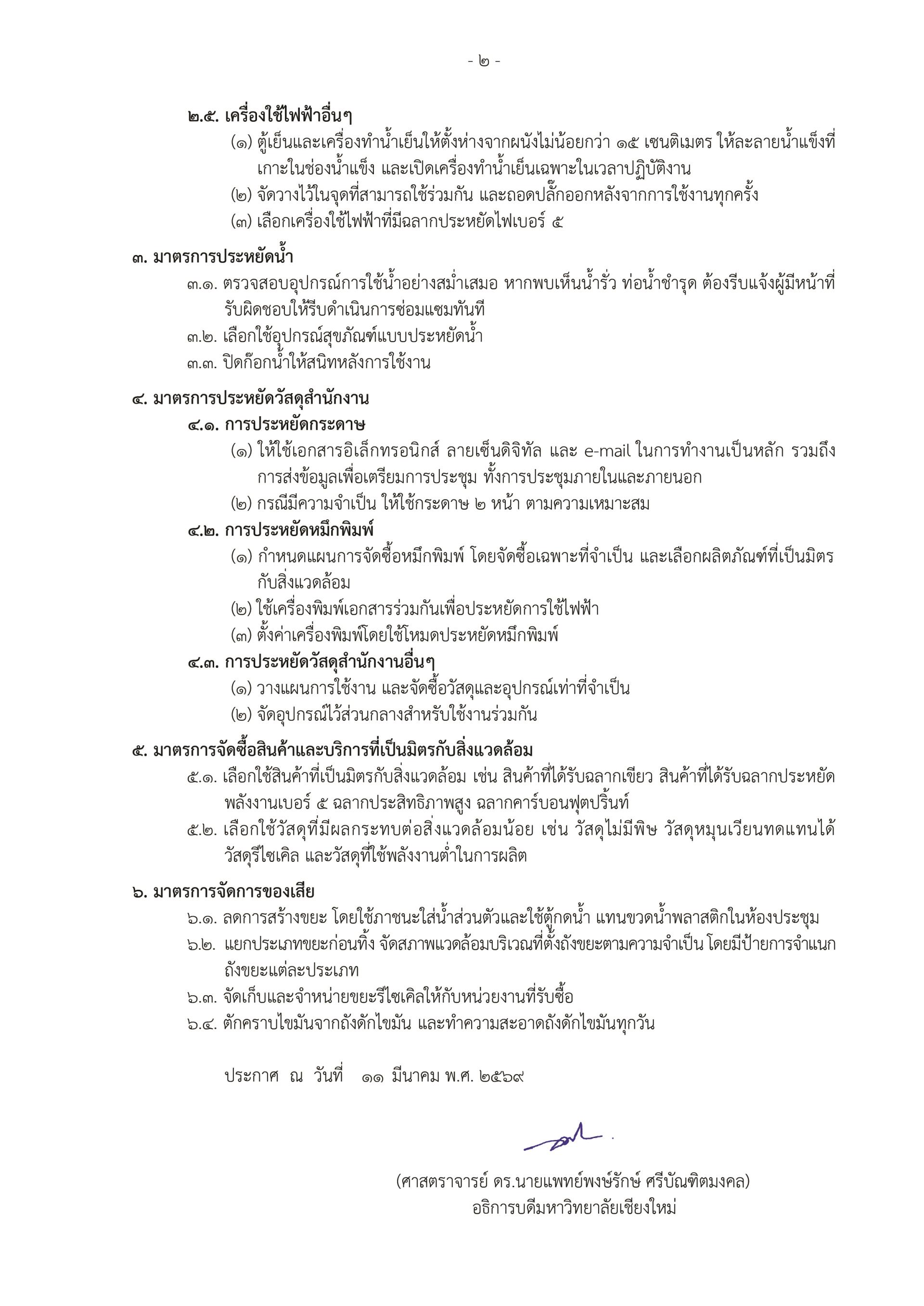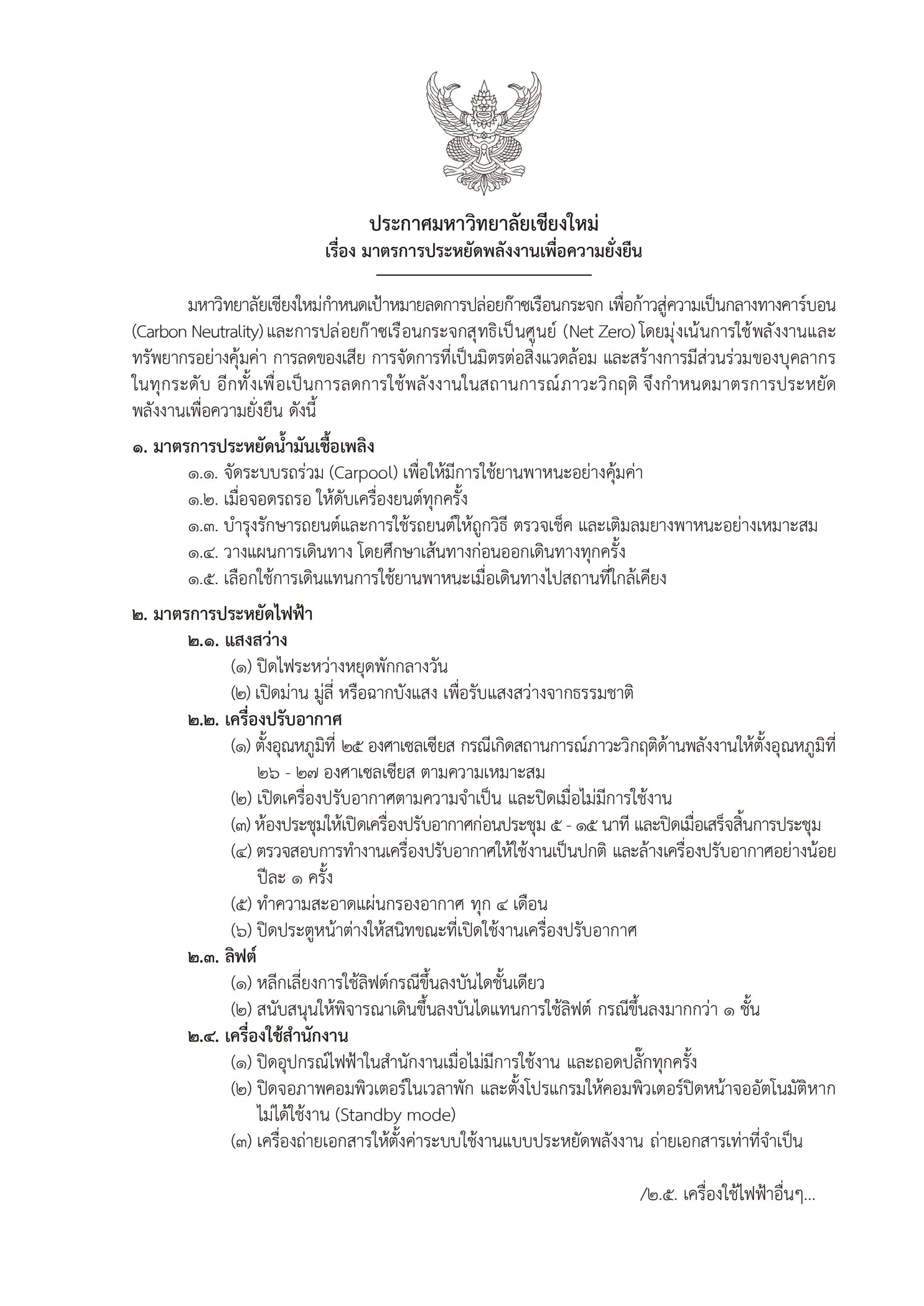 ประกาศมหาวิทยาลัยเชียงใหม่ เรื่อง มาตรการประหยัดพลังงานเพื่อความยั่งยืน